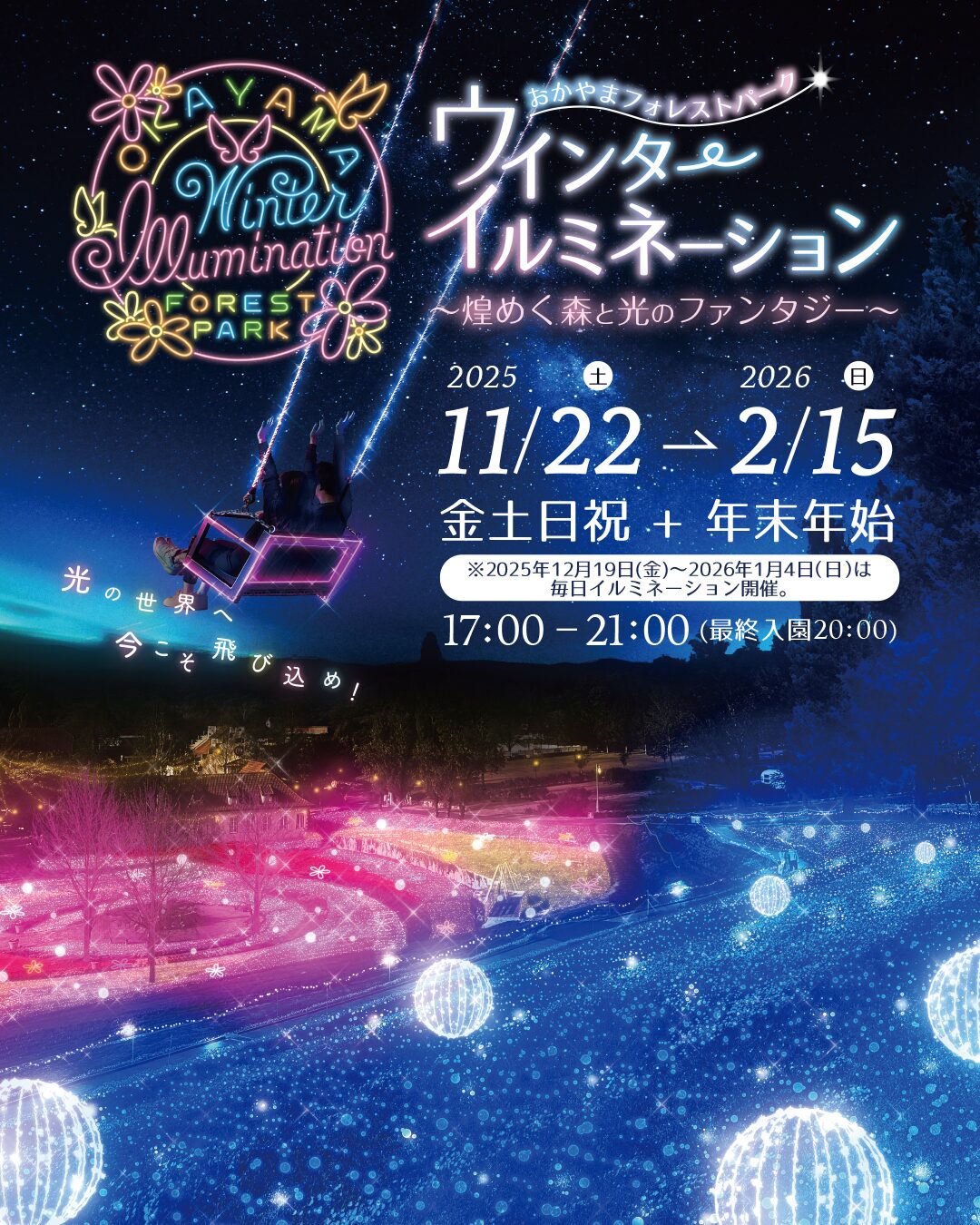 おかやまフォレストパーク ドイツの森で開催されるウィンターイルミネーション2025-2026は、約三十万球のライトで園内が輝く冬の人気イベントです。光に包まれた花畑の世界が広がるほか、昨年話題となった「大きな森のブランコ」のイルミネーションバージョンが再登場し、幻想的な夜の森を体験できます。週末を中心にスカイランタンやクリスマスマーケットなどの催しも予定され、冬ならではの温かな時間を過ごせる盛りだくさんの内容になっています。家族連れやカップル、写真を楽しむ方にもおすすめのイルミネーションです。